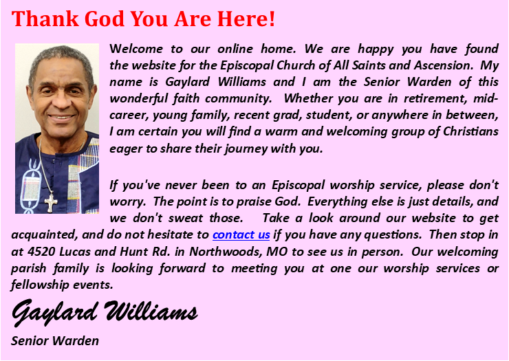 Visiting a church for the first time can be intimidating and might bring to mind a few questions. When you first step into All Saints and Ascension you will find a warm welcoming community ready to invite you to share in our faith journey. Our greeters will meet you shortly after you walk through the those red doors. Please identify yourself as a visitor and the greeters will assist you with signing the guest registry and getting you situated. They will answer any questions you may have and help you get seated. You will also be provided a worship bulletin. We use this bulletin to follow along with the order of service.